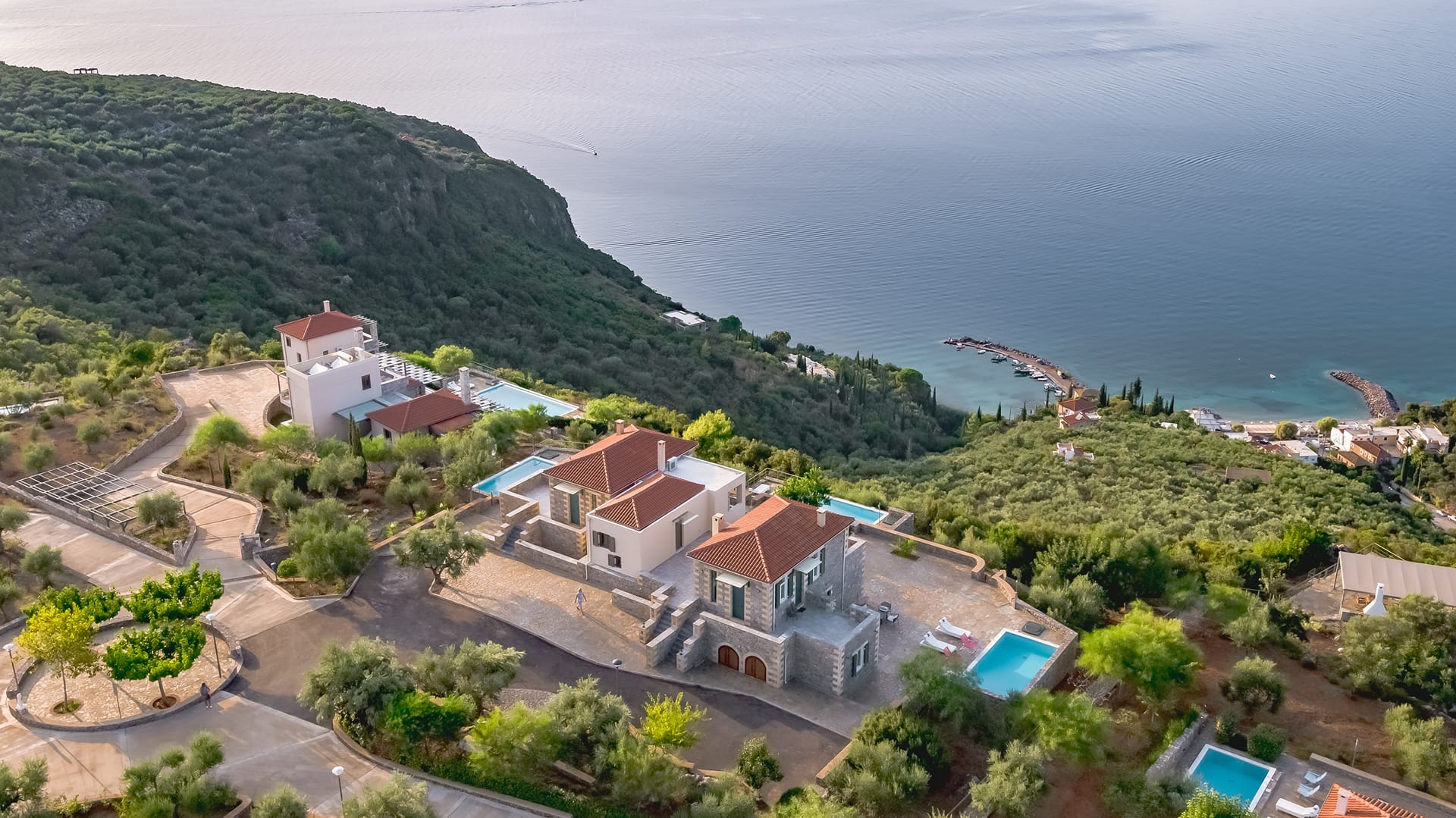 The olive groves, stone walkways dotted rich flora surrounding the villas, are all encircled by a private forest offering total seclusion from the outside world.